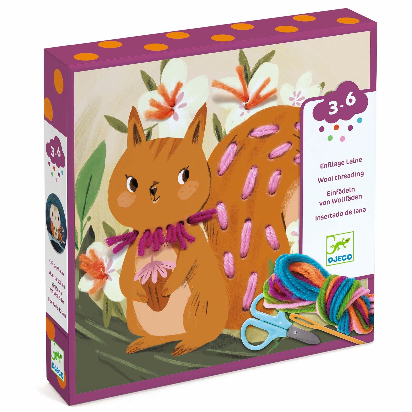 4 dikke kartonnen cirkels, geïllustreerd en met gaten. 20 strengen wol van 50 cm. 5 kleuren. 1 naald. 1 schaar. 1 boekje.