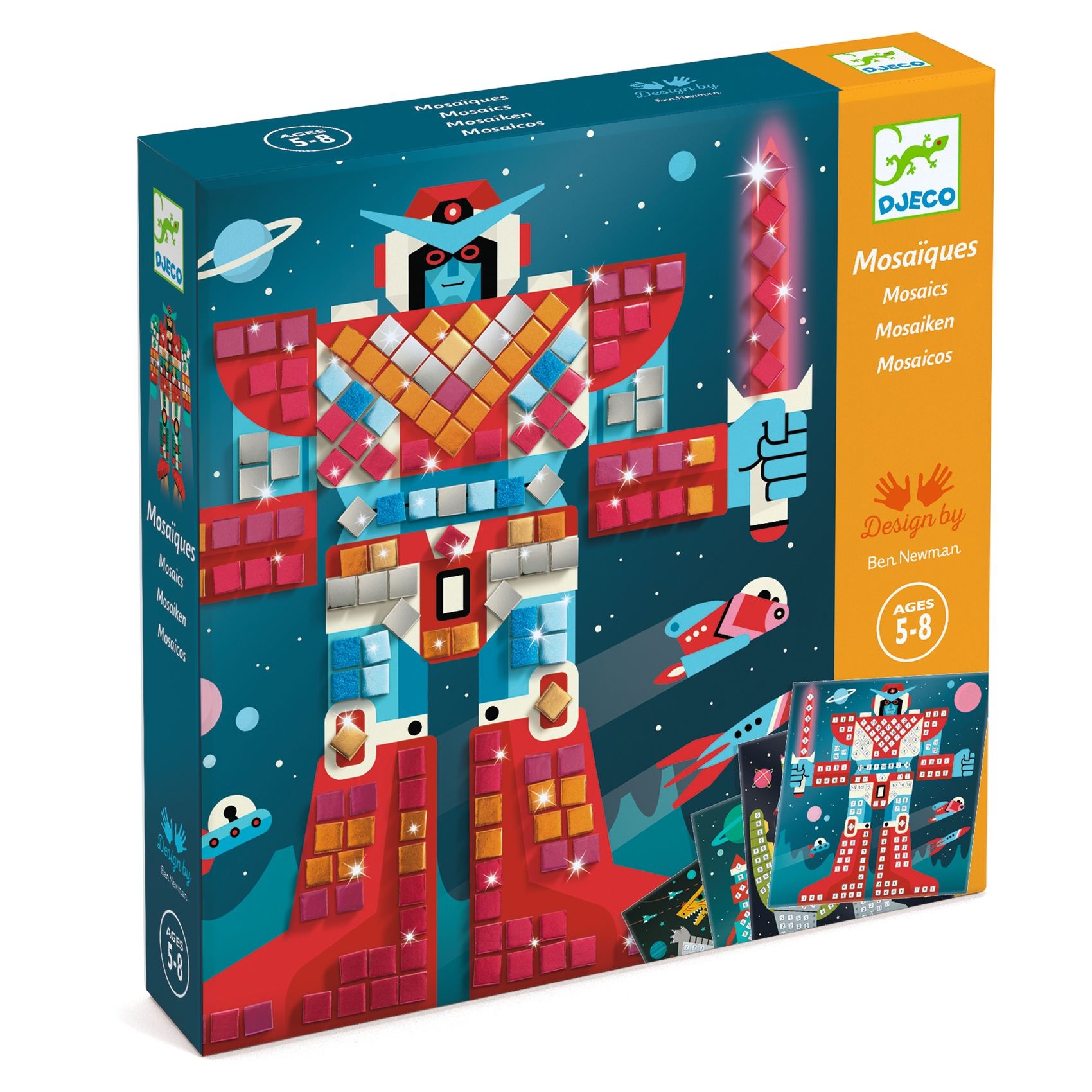 Een set om de kunst van het mozaïek te leren, waarin robots vechten tegen angstaanjagende monsters. Vier afbeeldingen om te voltooien met kleine vierkantjes van metallic schuim die als stickers werken. Het kind zoekt de nummers op en plakt vervolgens de bijbehorende stukjes op de aangegeven plek op het bord. De afbeeldingen worden gevuld en de personages komen tot leven.