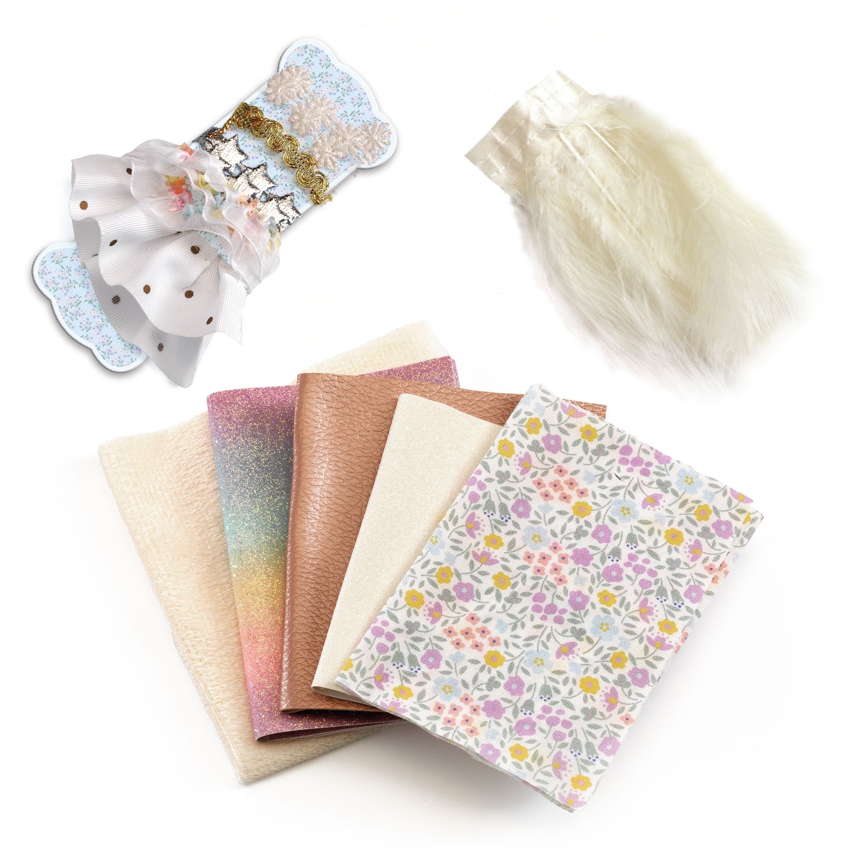 3 poppen, 3 houten bases, 1 bedrukte stof, 4 stoffen van verschillende materialen, 5 vlechten of linten, 2 elastische draden, een zakje kralen en kleine accessoires, 1 vel zelfklevende strass-steentjes, 1 schaar, 1 rol dubbelzijdige tape, 1 pen, 3 vellen met patronen
