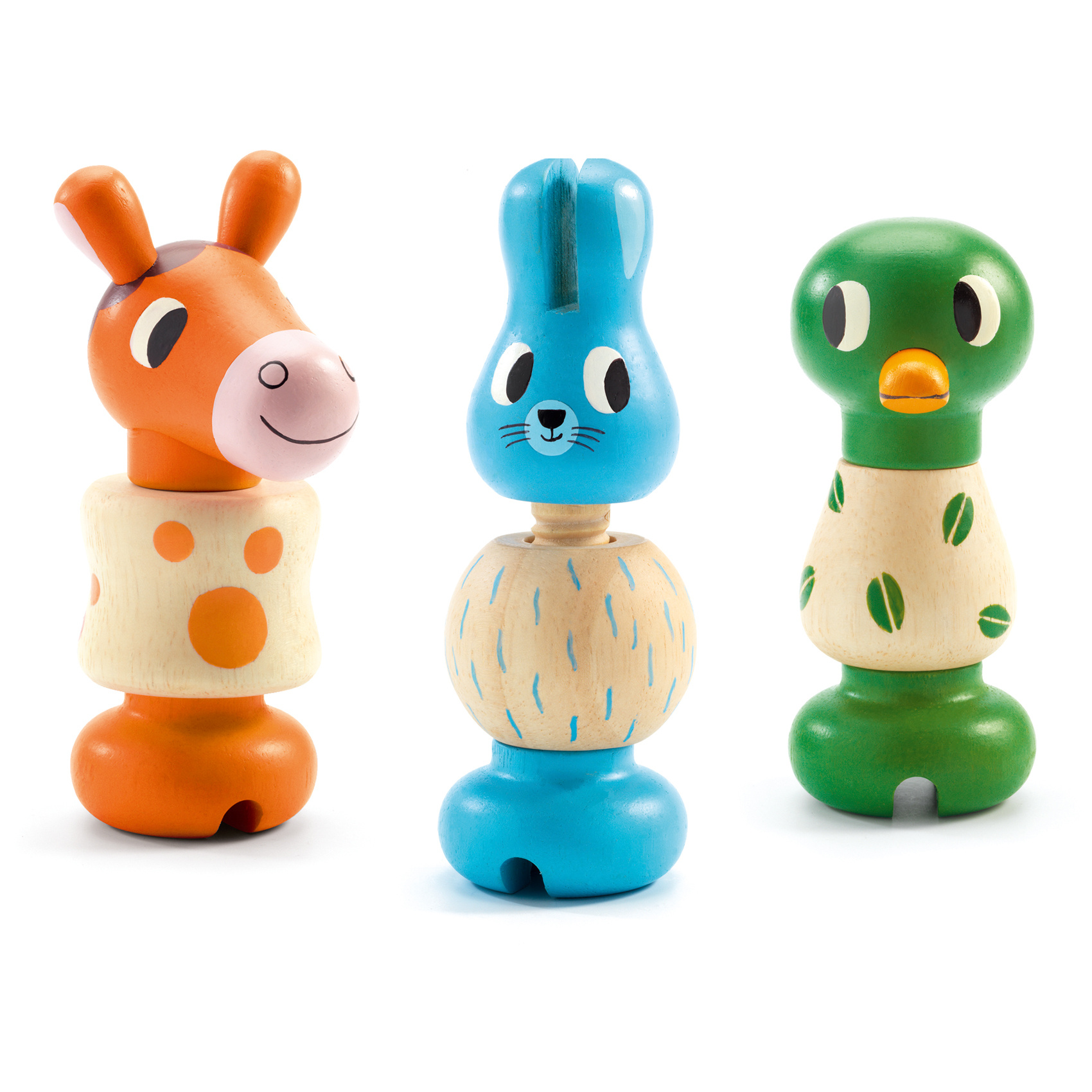 Een bouwset om 3 houten dieren te maken (een paard, een konijn en een eend)! Het kind kiest een schroef in de vorm van een dierenkop en zoekt het bijpassende lijfje en de voet om erop te schroeven. Ze zetten de onderdelen in elkaar door ze aan elkaar te schroeven en spelen vervolgens met de dieren.